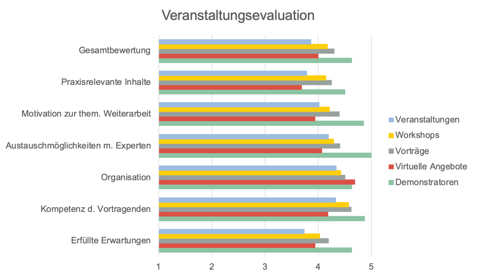 Durchschnittliche Bewertungen der Veranstaltungen auf einer fünfstufigen Likert-Skala (1 - trifft gar nicht zu, 5 - trifft völlig zu)