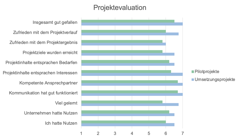 Durchschnittliche Bewertungen der Pilot- und Umsetzungsprojekte auf einer siebenstufigen Skala (1 - gar nicht hoch, 7 - sehr hoch)