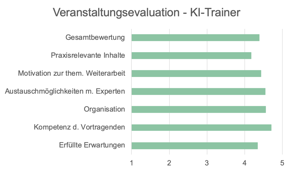 Durchschnittliche Bewertungen der KI-Trainer-Veranstaltungen auf einer fünfstufigen Likert-Skala (1 - trifft gar nicht zu, 5 - trifft völlig zu)