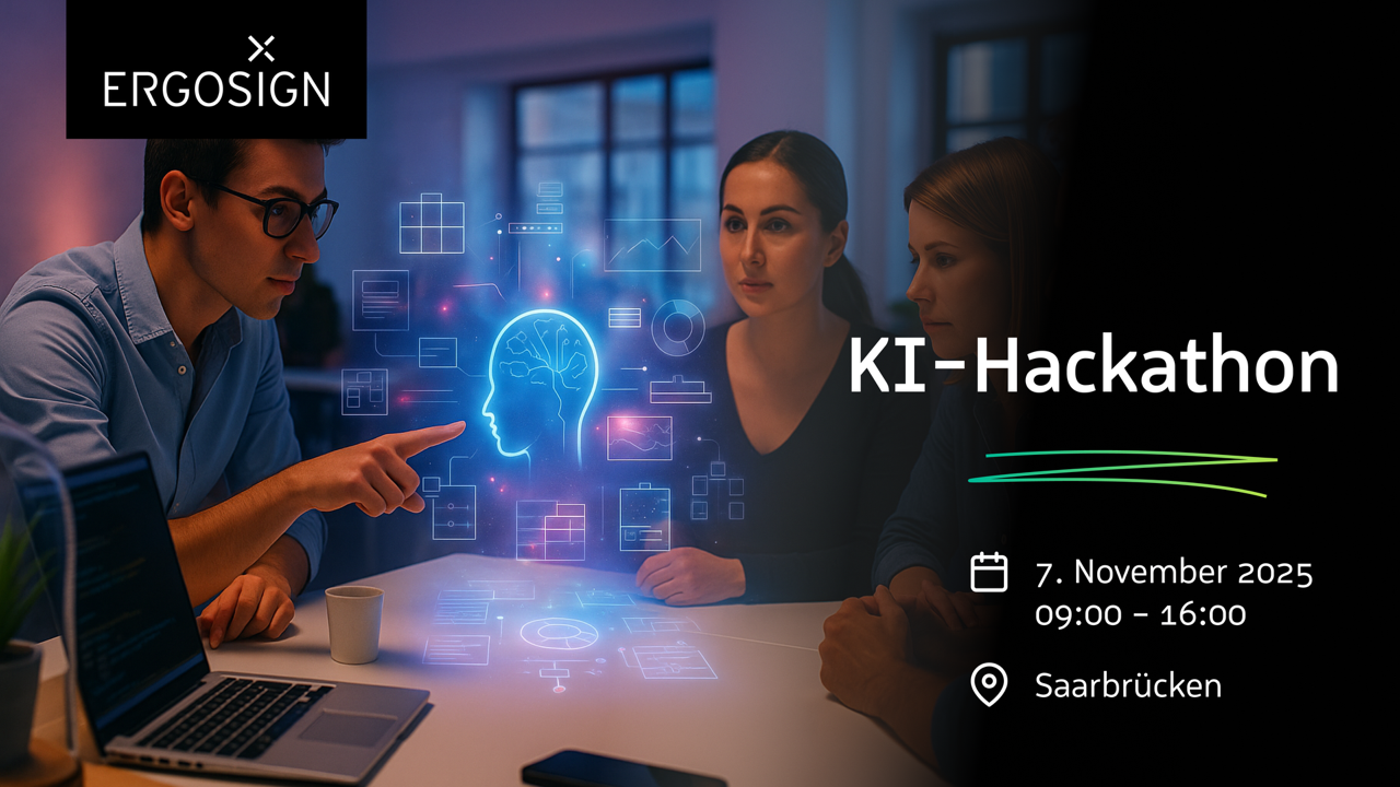 Das Bild ist eine Ankündigung für einen KI-Hackathon. Zu sehen sind drei Personen, die um einen Tisch sitzen und sich über ein digitales Hirn mit verschiedenen Datenvisualisierungen unterhalten. Auf dem Tisch befinden sich ein Laptop, ein Smartphone und eine Tasse. Der Text auf der rechten Seite des Bildes informiert über den Namen des Events, das Datum, die Uhrzeit und den Ort.