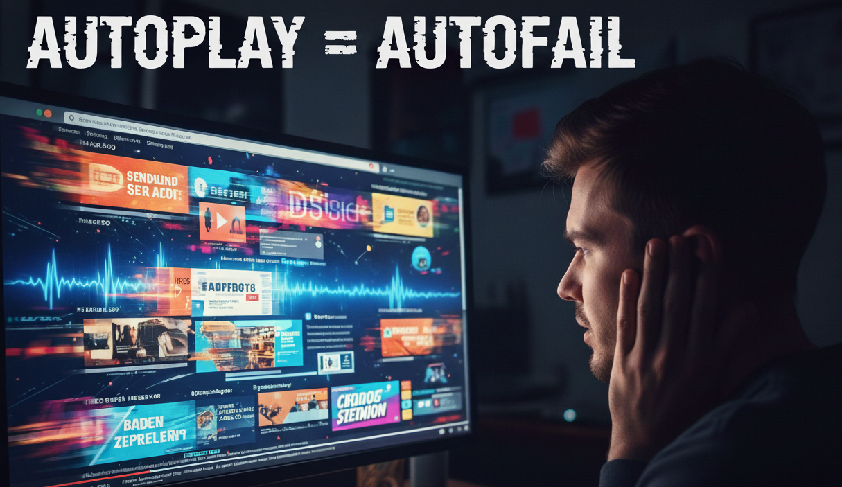 Ein Mann sitzt vor einem Bildschirm auf dem viele Videos und Audio gleichzeitig abgespielt werden. Der Mann hält sich die Ohren zu.