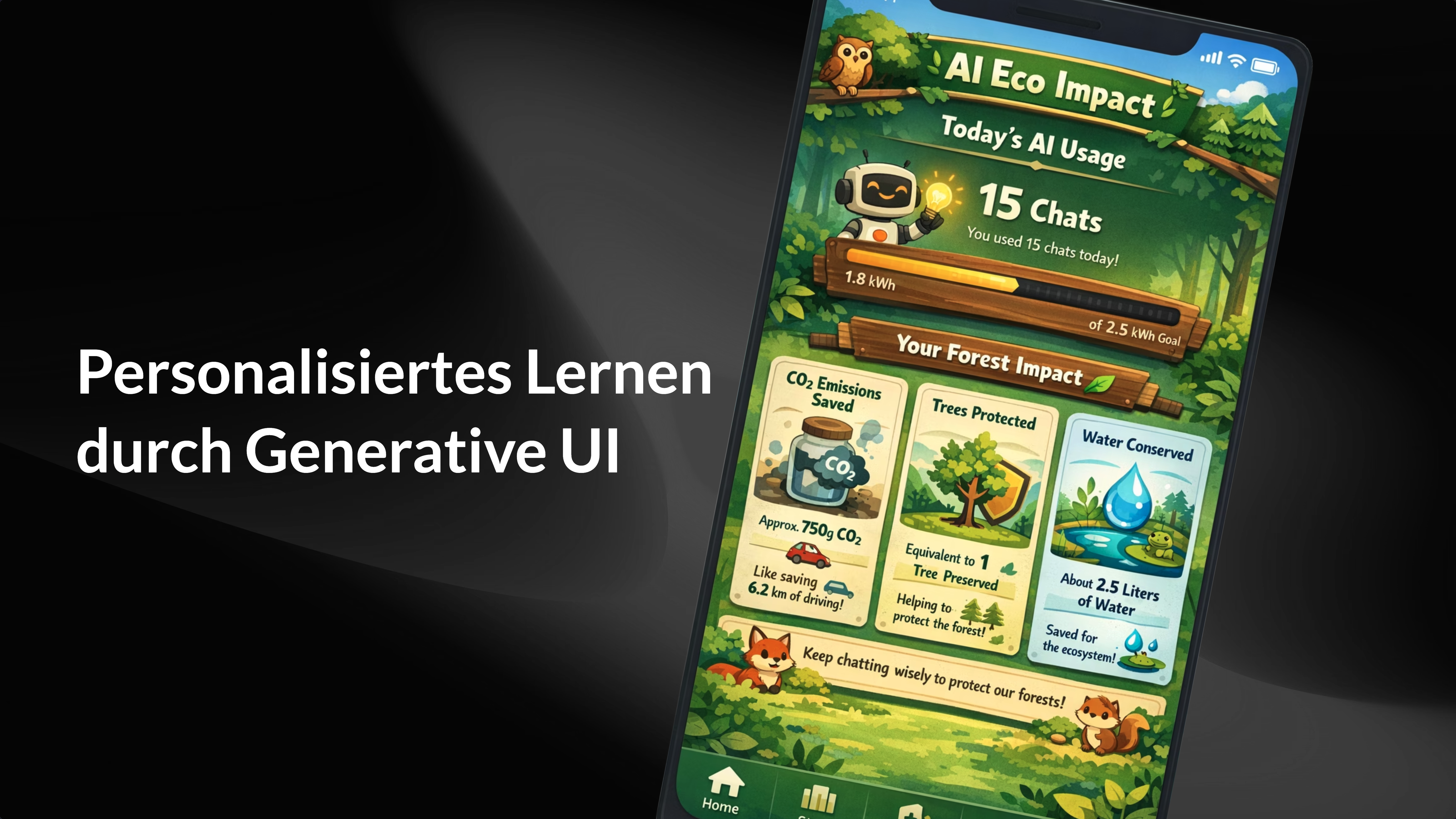 Vortragstitel neben einem Screenshot einer App zur Darstellung von KI-Verbrauch im Umweltkontext.