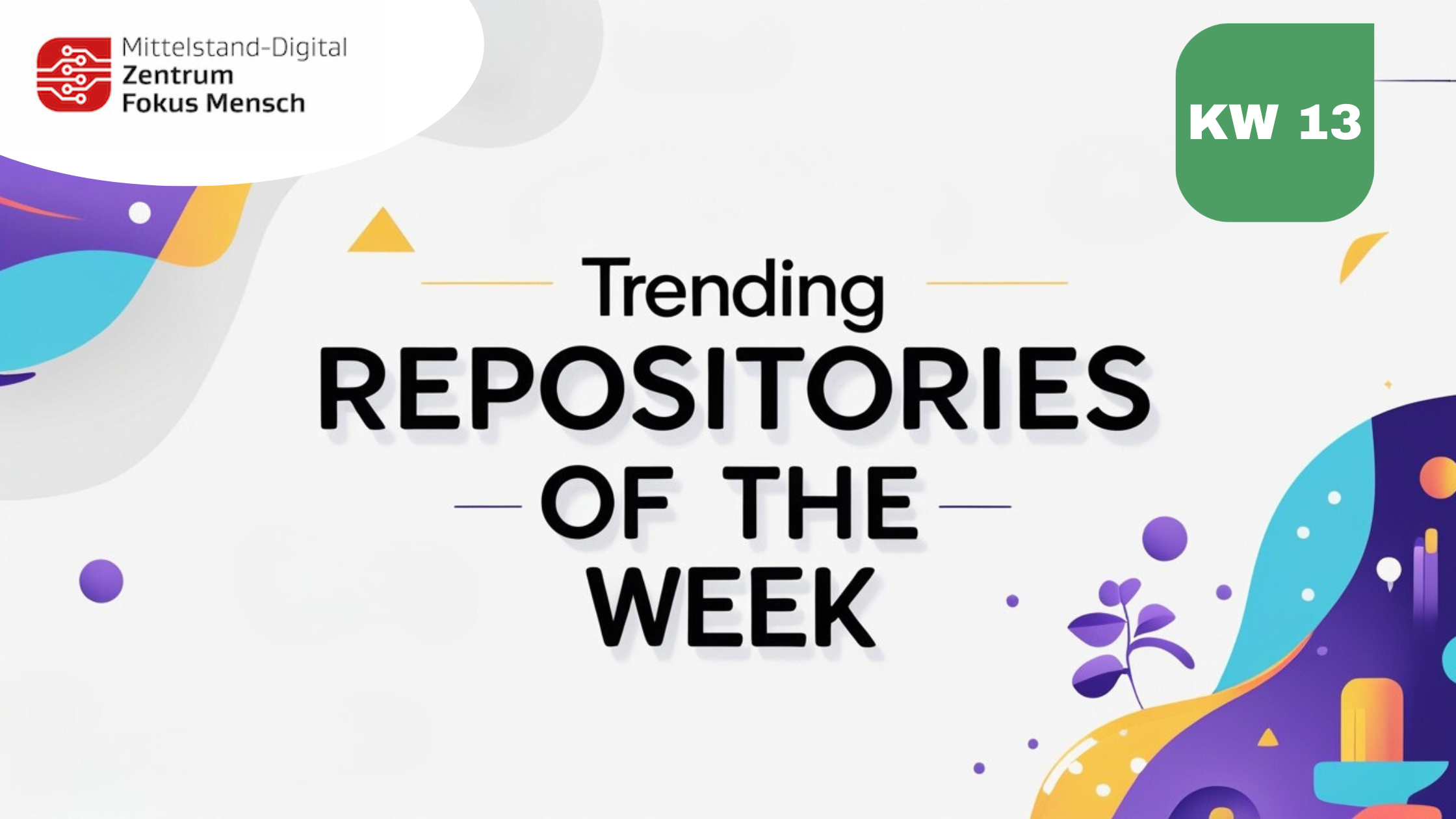 Das Bild zeigt den Text "Trending Repositories of the Week" mit dem Logo von Mittelstand-Digital Zentrum Fokus Mensch und der Kennzeichnung KW 13.