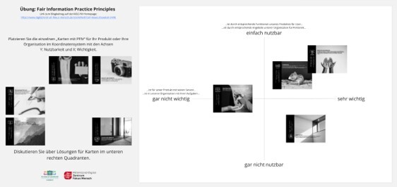 Am Mittwoch den 20.11.2024 trafen sich Interessierte und Vortragende des Mittelstand-Digital Zentrums „Fokus Mensch“ zum zweiten Mal zum neuen Snacktime- Format. Zwischen 8:30 und 9:00 Uhr wurden beim ersten und zweiten Kaffee des Tages die Fair Information Practice Principles (FIPPs) vorgestellt. Susen Döbelt der TU Chemnitz gab zu den Privatsphären-Richtlinien eine Einführung. Die Teilnehmenden konnten anschließend mit Julian Bornemeier eine Übung zum Thema (siehe Abbildung 1) ausprobieren. Grundlage für diese Snacktime waren die Inhalte und Materialien, welche HIER im Blogartikel detaillierter vorgestellt werden.