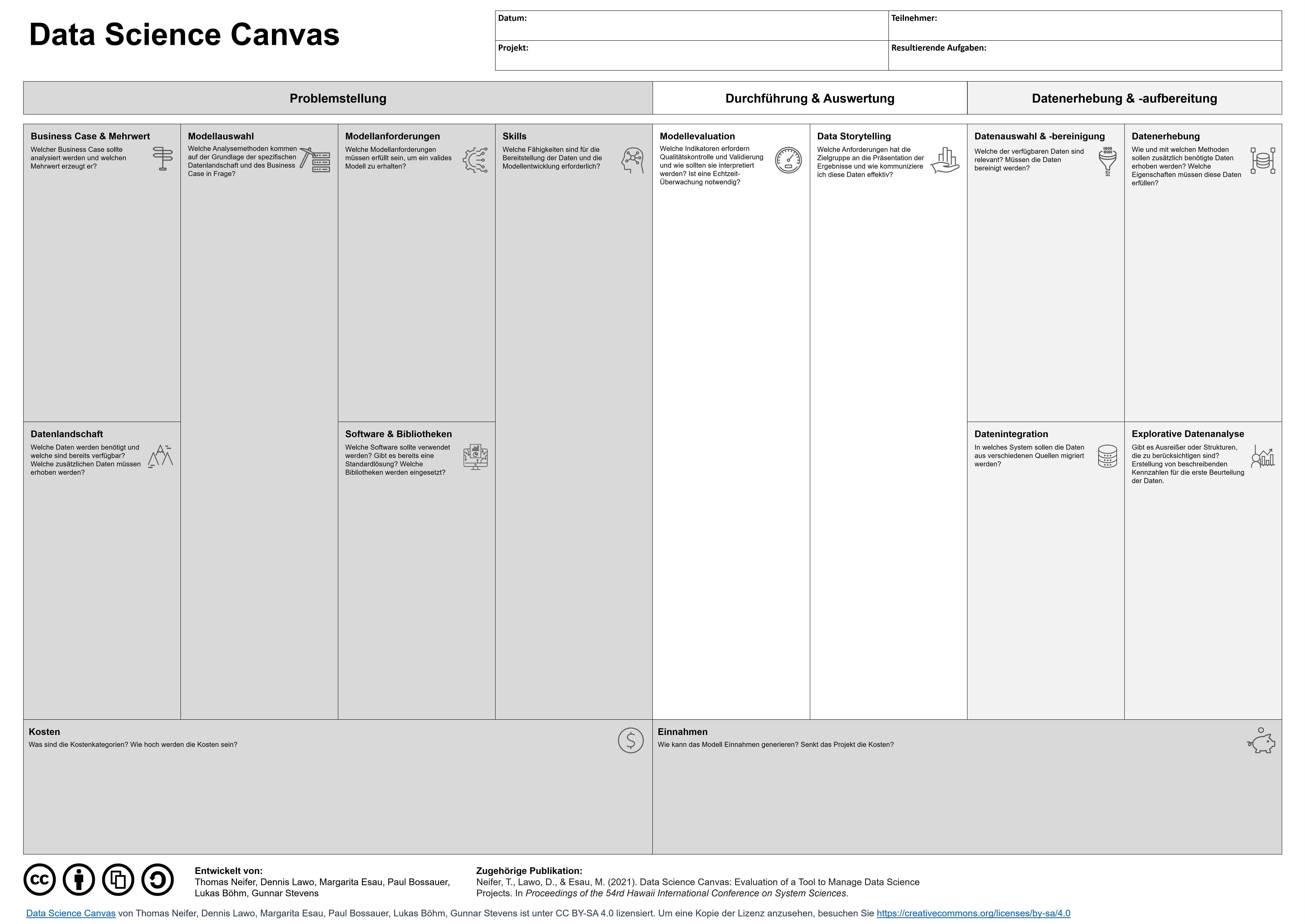 Falls Sie den Data Science Canvas in Ihren Projekten anwenden möchten, finden Sie eine Druckvorlage hier (github.com/tomalytics/datasciencecanvas) zum Download. Dort finden Sie auch weitere hilfreiche Dokumente zum Data Science Canvas. Weiterhin stehen die Autorinnen Ihnen gerne bei Rückfragen zur Verfügung.